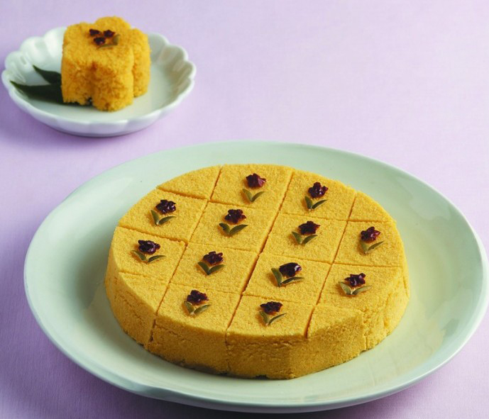 Luego sacar la pulpa de la calabaza (170 gr.). Mezclar la pulpa de la calabaza con harina y azúcar, y luego colar.Verter agua en la olla vaporera, hervir durante 9 min.a fuego fuerte. Cuando hierva, colocar